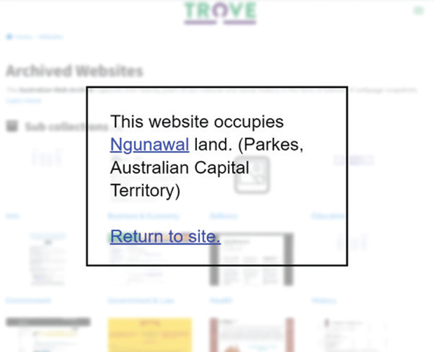 Figure 2. An acknowledgement that the Australian Web Archive website is physically stored on unceded Ngunnawal land, using the Web Acknowledgement extension for Google Chrome by Caleb Stone. The website used is webarchive.nla.gov.au (screenshot taken on 11 December 2021). © Caleb Stone. Reuse not permitted.